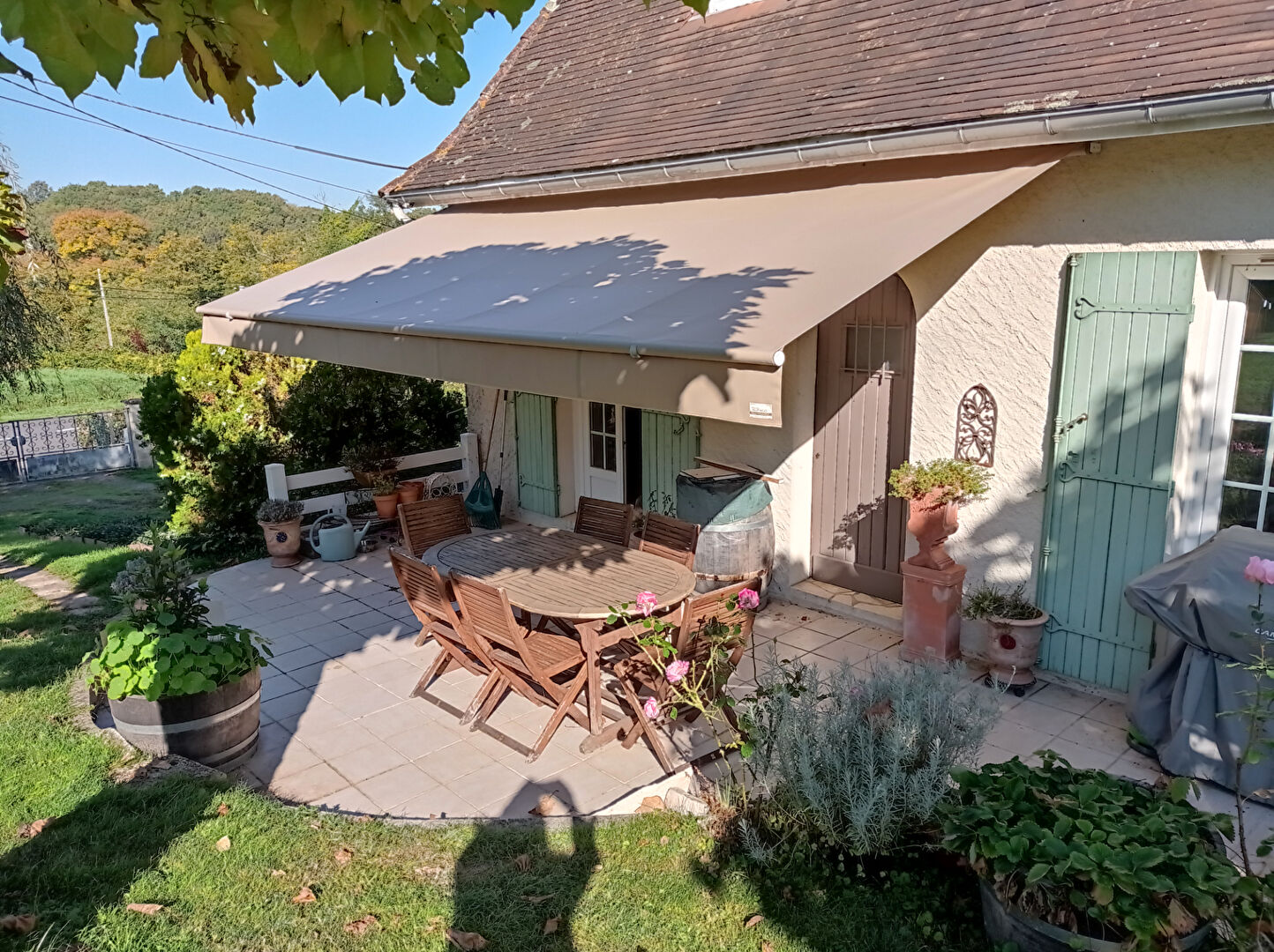 A l’extérieur, une agréable terrasse couverte permet de profiter pleinement des beaux jours, donnant sur un joli jardin.