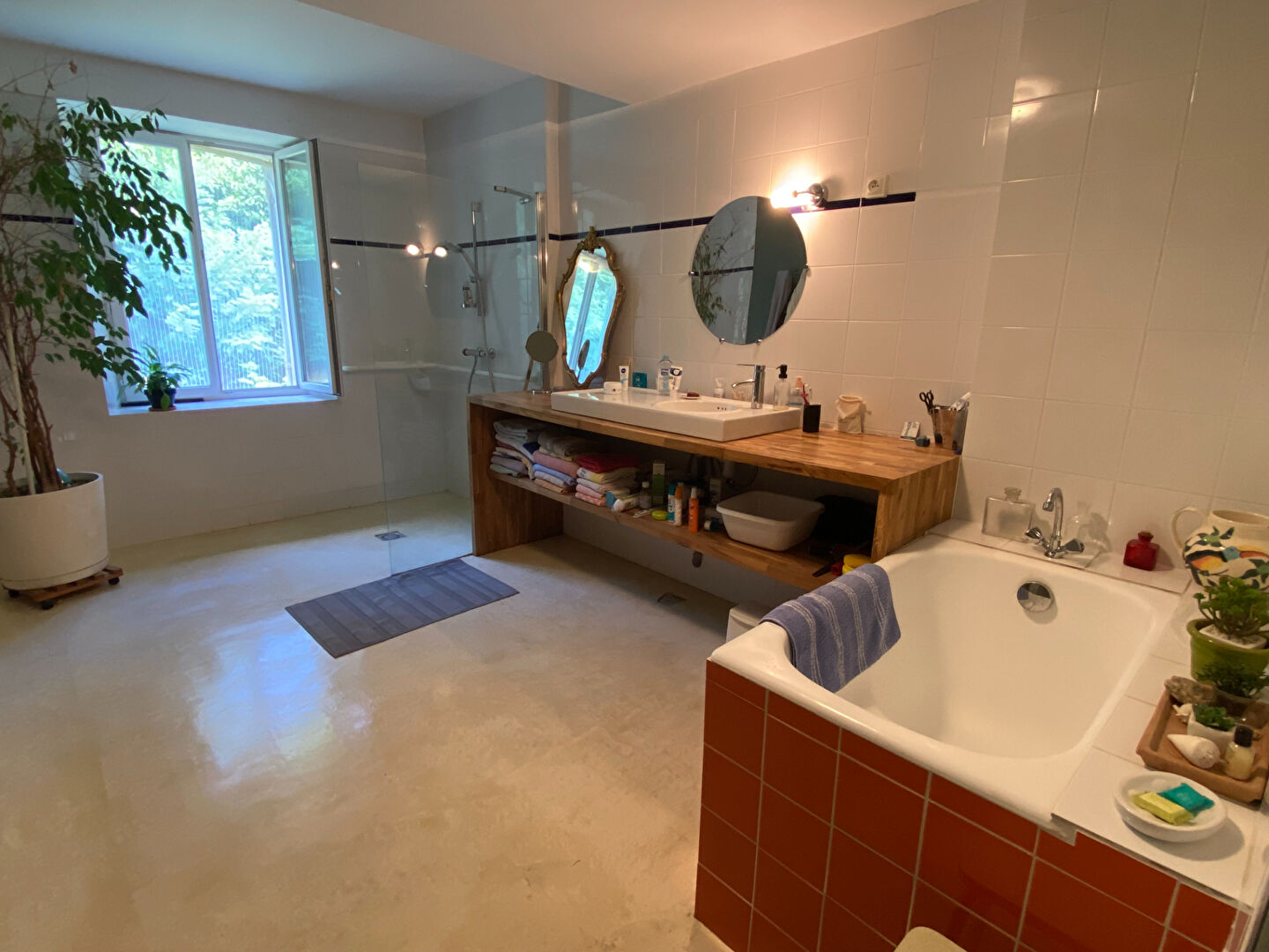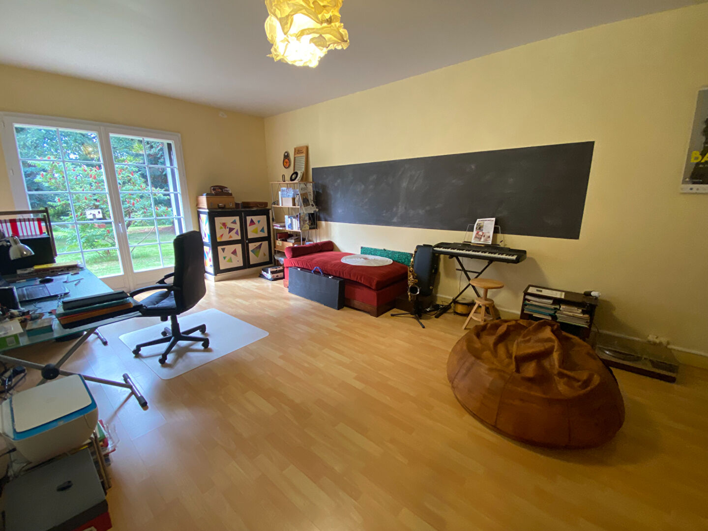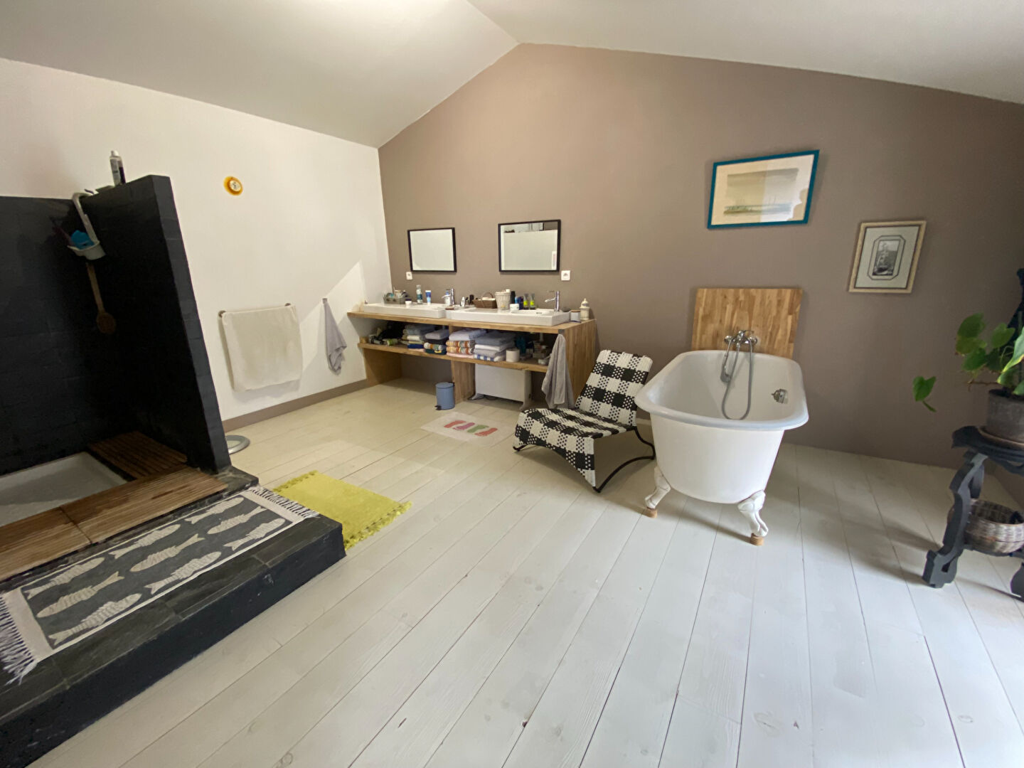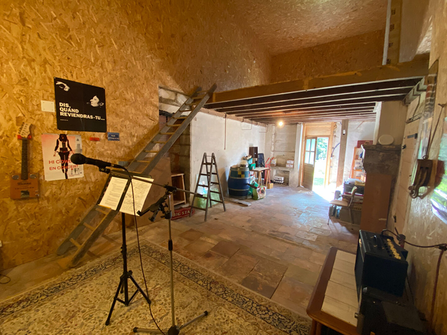 La maison principale, rénovée avec goût dans un style mêlant contemporain et classique, offre de beaux volumes et une belle luminosité. Vous y découvrirez une vaste pièce de vie donnant sur le jardin, avec une cuisine équipée et une superbe cheminée en pierre. Une seconde grande pièce, utilisée actuellement comme salle de musique, ainsi qu’une chambre et une salle de bains complètent le rez-de-chaussée.