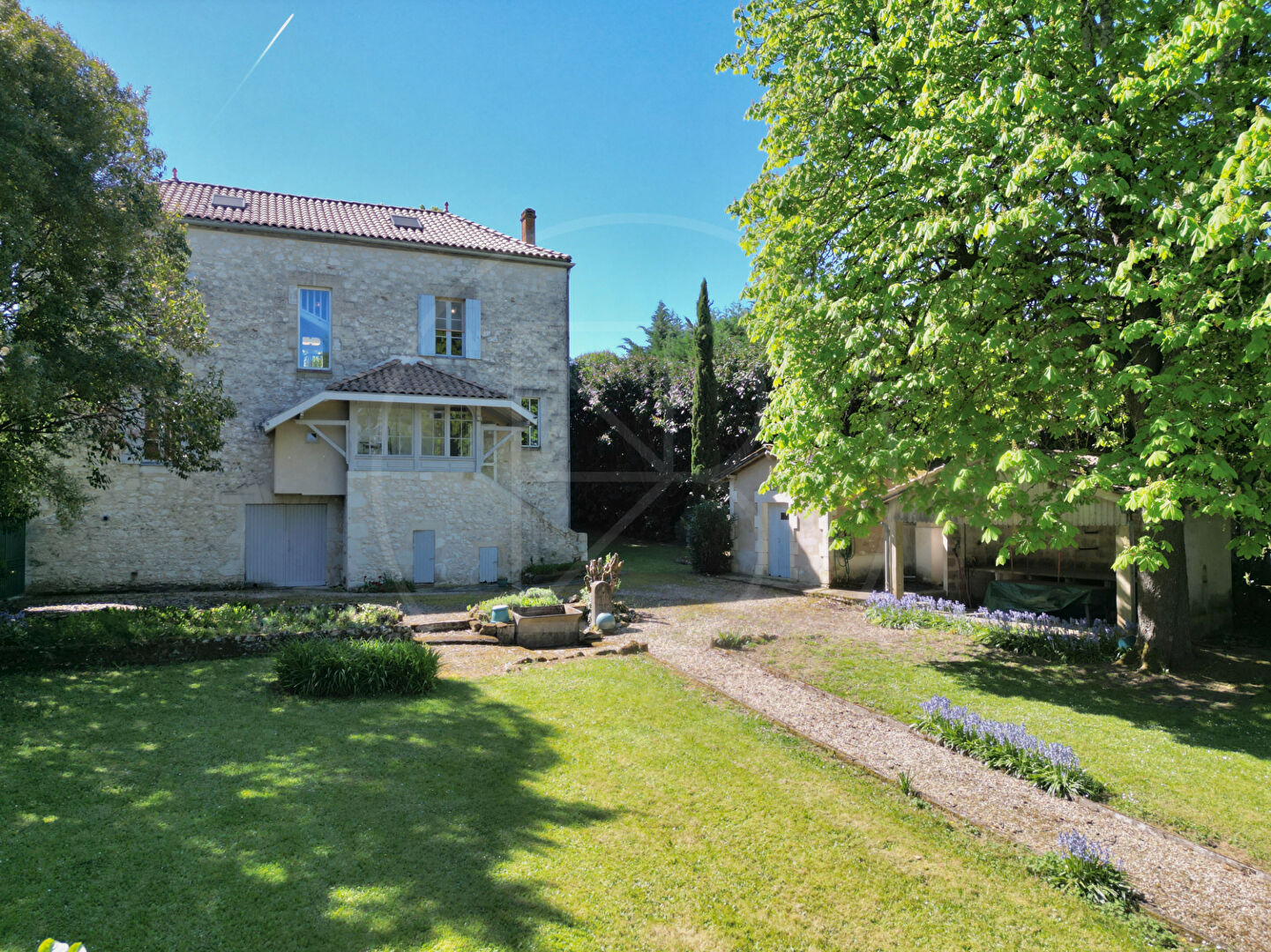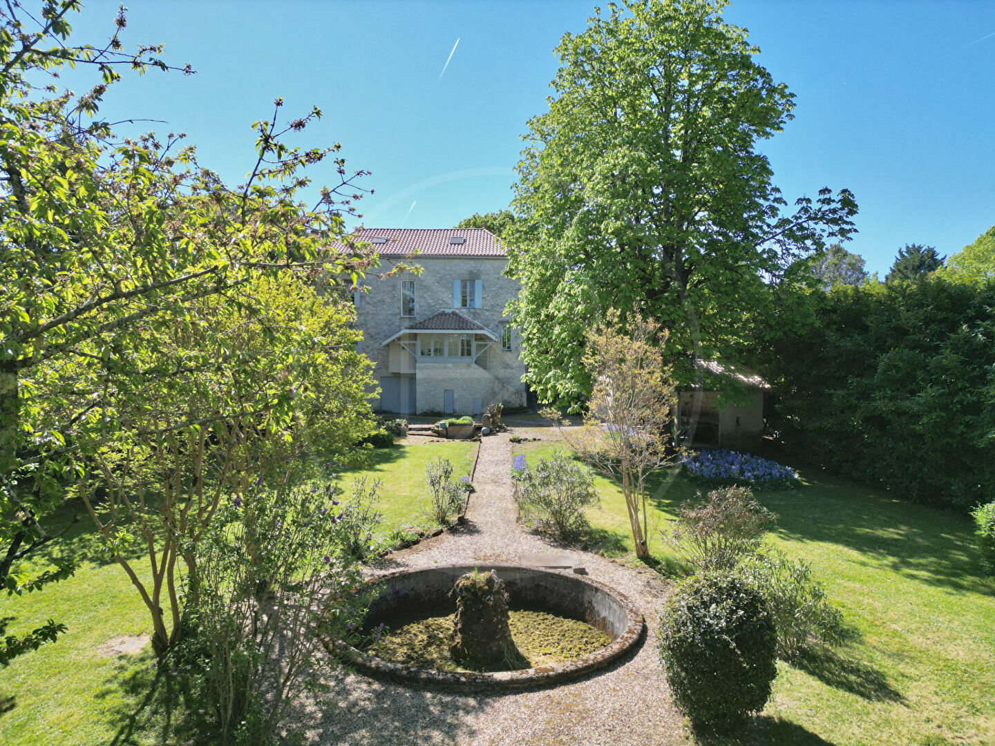 La façade de la maison donne directement sur le village et son église. Le parc de 2 hectares, situé à l’arrière de la propriété, comprend également quelques dépendances. Une véritable maison de campagne au coeur du village ! (5.00 % honoraires TTC à la charge de l’acquéreur.)