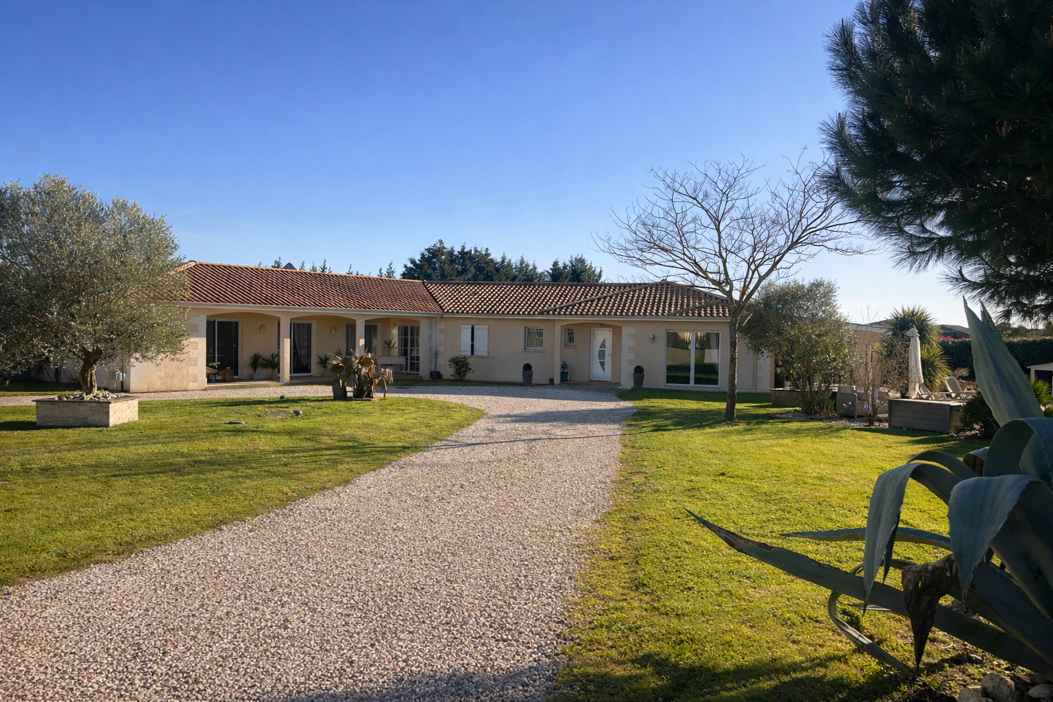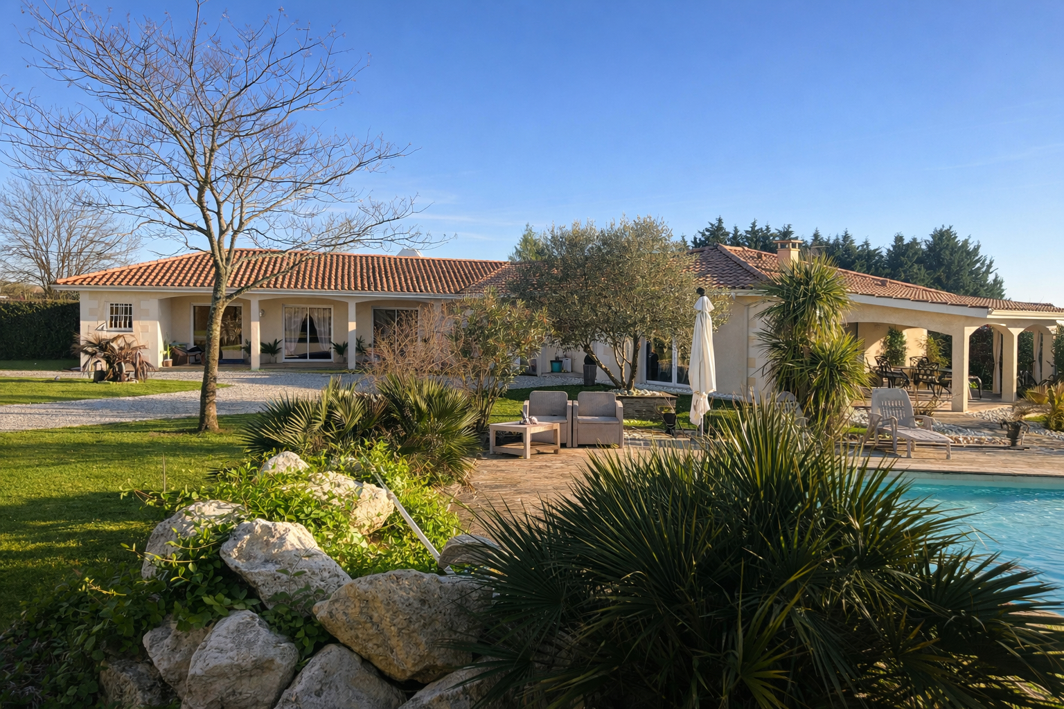 A superb single-storey house offering approximately 190 m² of living space, set within a beautifully landscaped and generous plot of 2014 m², complete with a swimming pool.